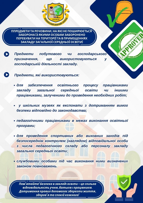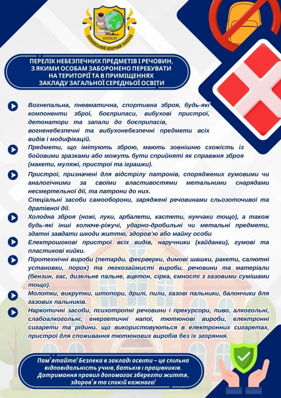 Відповідно до постанови Кабінету Міністрів України від 14 січня 2026 року № 70 затверджено Перелік небезпечних предметів і речовин, з якими особам заборонено перебувати на території та в приміщеннях закладу загальної середньої освіти.