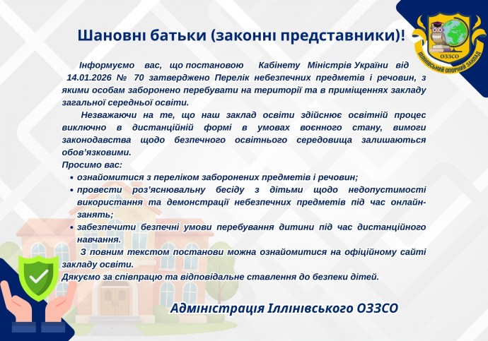 Постанова Кабінету Міністрів України від 14.01.2026 № 70 затверджено Перелік небезпечних предметів і речовин, з якими особам заборонено перебувати на території та в приміщеннях закладу загальної середньої освіти.