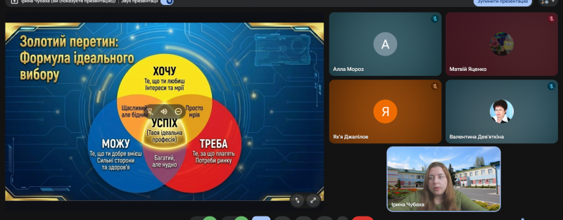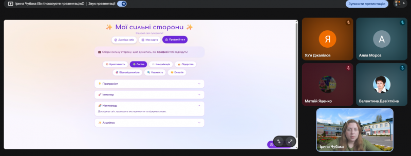 Особливу увагу було приділено розвитку навичок самоаналізу та рефлексії. Учні виконували інтерактивні вправи, працювали з ментальними картами, обговорювали свої інтереси та захоплення, вчилися співвідносити їх із можливими напрямами професійної діяльності.