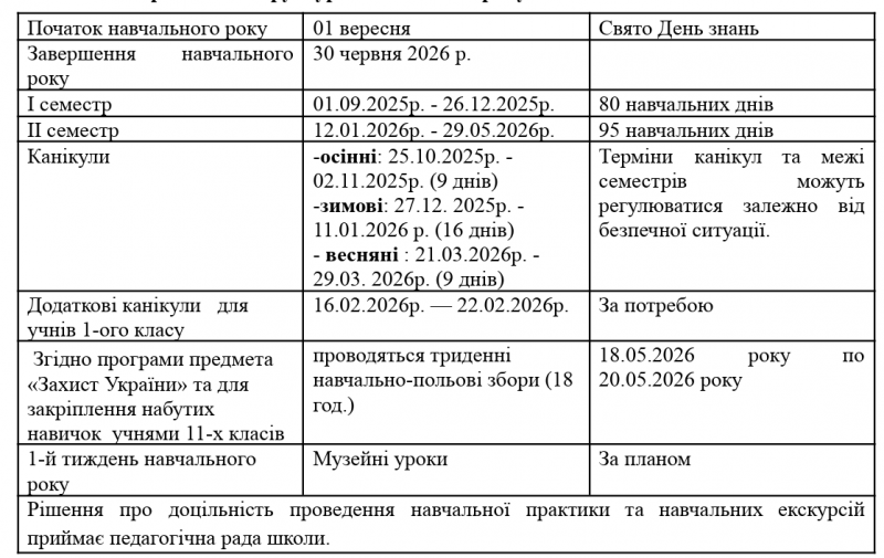 Відповідно до пункту 3 статті 10 Закону України «Про повну загальну середню освіту» навчальний рік розпочинається 1 вересня святом «День знань», триває не менше 175 навчальних днів і закінчується не пізніше 1 липня. Під час дії воєнного стану, введеного Указом Президента України «Про введення воєнного стану в Україні» від 24 лютого 2022 року № 64/2022, затвердженим Законом України «Про затвердження Указу Президента України «Про введення воєнного стану в Україні», відповідно до пункту 2-1 Закону № 2315-IX від 19.06.2022 тривалість навчального року, дата його початку та/або закінчення визначаються Кабінетом Міністрів України. Навчальні заняття організовуються за семестровою системою.