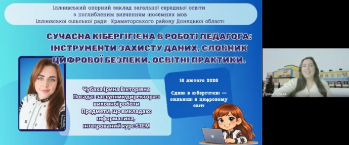 16 лютого 2025 року участь в онлайн-інфосесії «Кібергігієна в щоденній роботі педагога: прості правила безпеки» взяла Ірина Чубаха, заступник директора з виховної роботи, учитель інформатики та інтегрованого курсу STEM Іллінівського опорного закладу загальної середньої освіти з поглибленим вивченням іноземних мов Іллінівської сільської ради Краматорського району Донецької області.