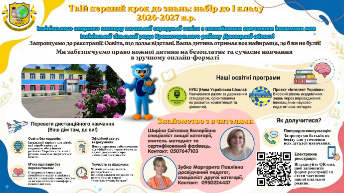 Іллінівський ОЗЗСО з поглибленим вивченням іноземних мов оголошує набір учнів до 1 класу на дистанційну форму навчання на 2026–2027 навчальний рік.