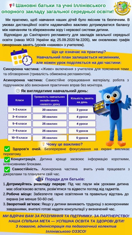 З 24 лютого 2022 року освітній процес в 1-11 класах відбувається в дистанційній формі.